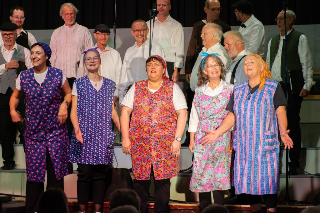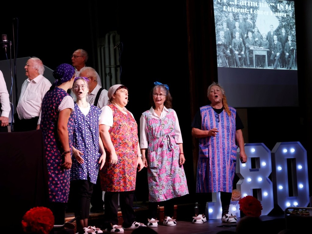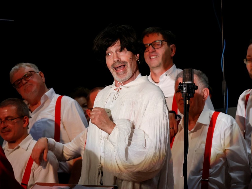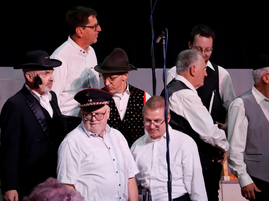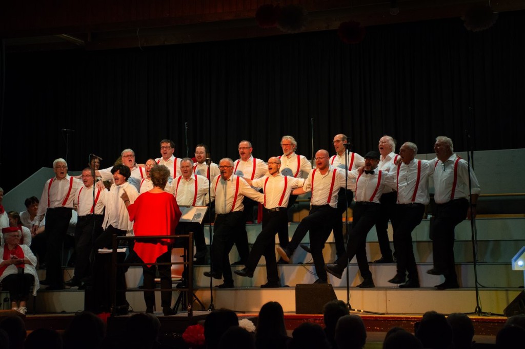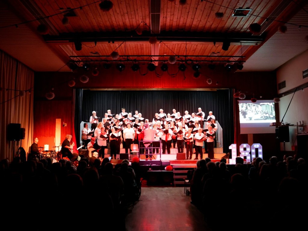 Nein, dies waren keine gängigen Jubiläumskonzerte. Keine Grußworte, keine Laudatio, kein langwieriger Konzertverlauf, sondern eine quicklebendige, rasante Zeitreise durch Jahrzehnte der Vereinsgeschichte zum „kleinen“ 180-Jährigen Bestehen unseres Vereines. Gesungen und für alle Sinne auch optisch und szenisch dargeboten mit viel Augenzwinkern und ausgewählten Einzelbildern aus mehreren Jahrzehnten. Bereits zu Beginn erntete Jörg Bregger als Oberlehrer Bäuerle, und sozusagen „Gründungsvater“ des Chores im Jahre 1845, Lachsalven, während sich die „Mannen“ noch schwer taten mit dem geordneten Singen. Die eher ungewöhnliche Geschichte des Vereines aufnehmend, in der bereits 1883 der erste Gemischte Chor bestand, gesellten sich schnell fünf Damen hinzu und zeigten den Herren im Song von den „Siebe chlieni Chüehli“, wie es geht. Danach sang sich der Chor abwechslungsreich durch die eigene Geschichte und Musikstücke in verschiedensten Stilrichtungen von Operette und Musical über Schlager bis hin zur Moderne mit Kulthits wie „Bohemian Rhapsody“ von Queen, „Thriller“ von Michael Jackson oder dem einfühlsamen „Fields of Gold“ von Sting.