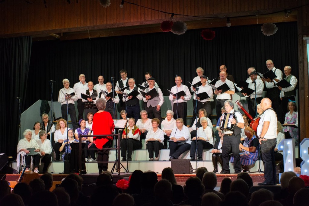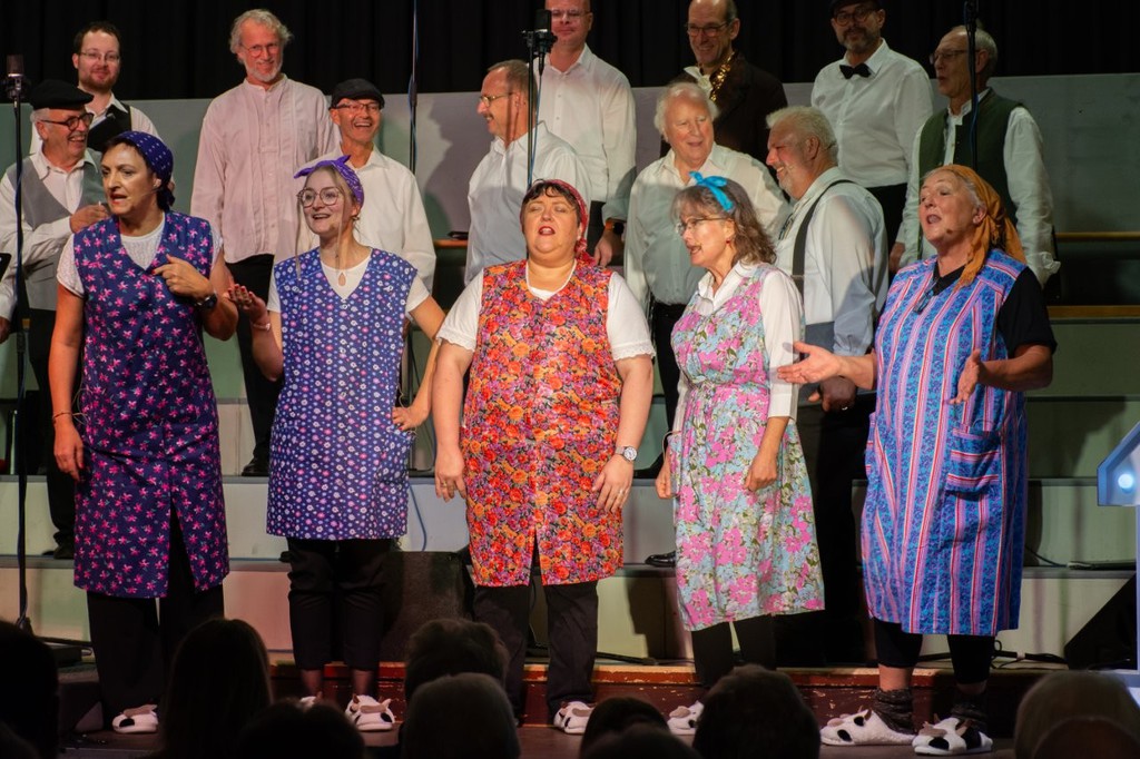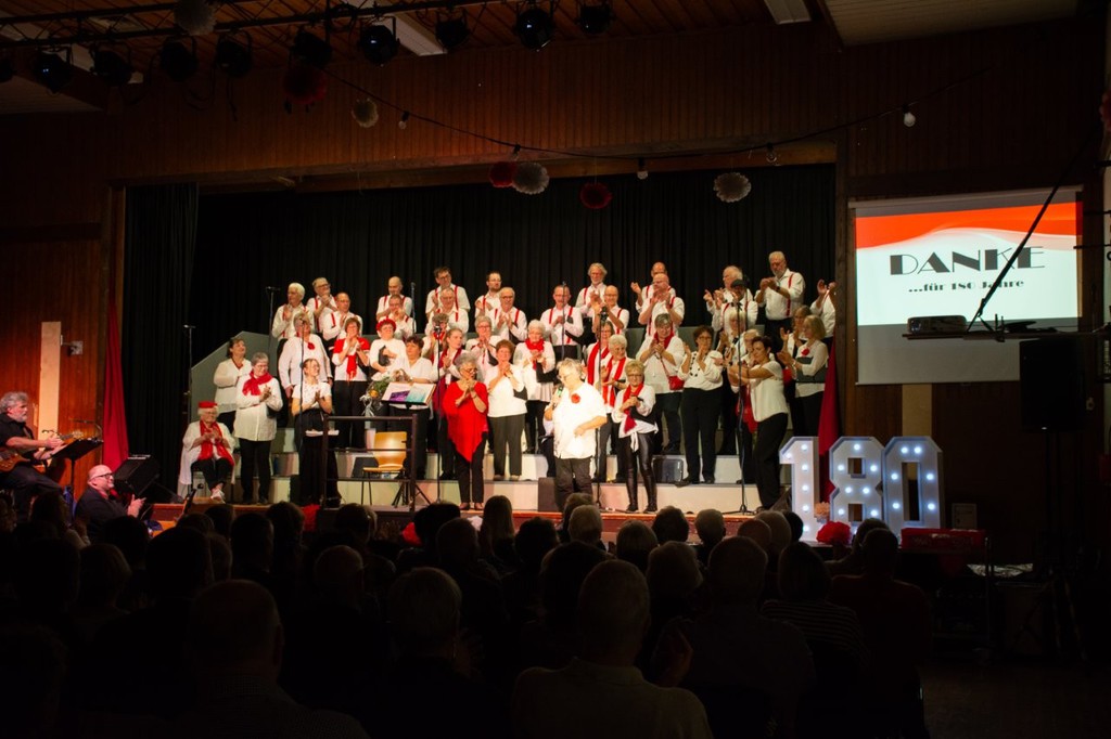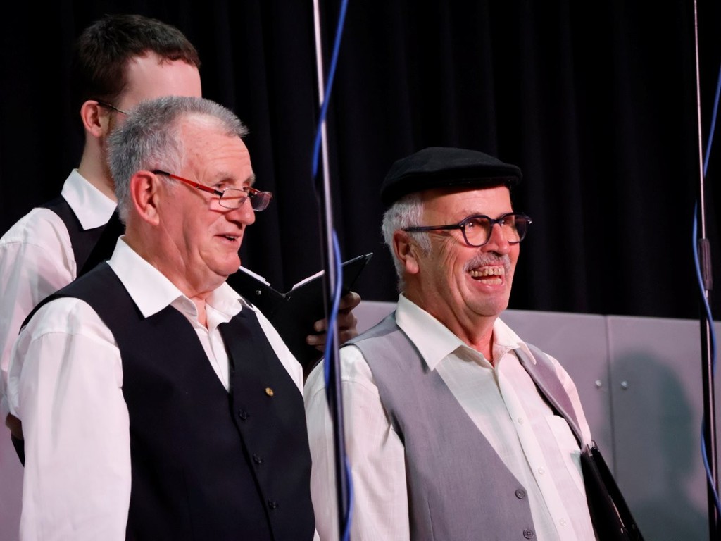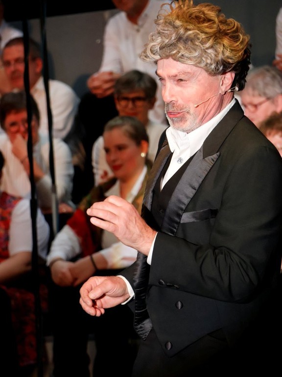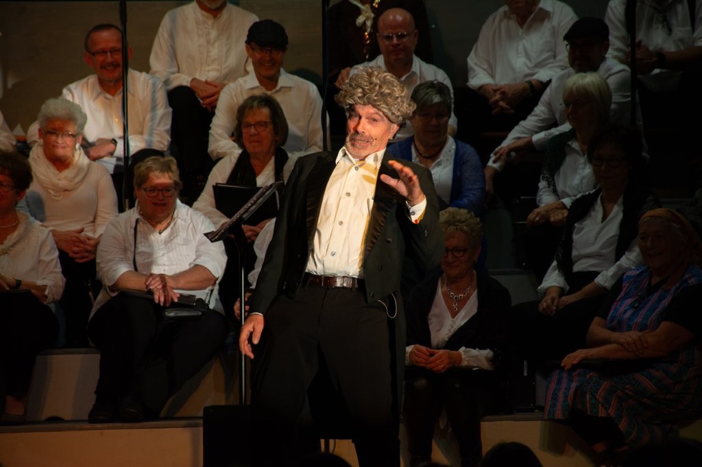 Nein, dies waren keine gängigen Jubiläumskonzerte. Keine Grußworte, keine Laudatio, kein langwieriger Konzertverlauf, sondern eine quicklebendige, rasante Zeitreise durch Jahrzehnte der Vereinsgeschichte zum „kleinen“ 180-Jährigen Bestehen unseres Vereines. Gesungen und für alle Sinne auch optisch und szenisch dargeboten mit viel Augenzwinkern und ausgewählten Einzelbildern aus mehreren Jahrzehnten. Bereits zu Beginn erntete Jörg Bregger als Oberlehrer Bäuerle, und sozusagen „Gründungsvater“ des Chores im Jahre 1845, Lachsalven, während sich die „Mannen“ noch schwer taten mit dem geordneten Singen. Die eher ungewöhnliche Geschichte des Vereines aufnehmend, in der bereits 1883 der erste Gemischte Chor bestand, gesellten sich schnell fünf Damen hinzu und zeigten den Herren im Song von den „Siebe chlieni Chüehli“, wie es geht. Danach sang sich der Chor abwechslungsreich durch die eigene Geschichte und Musikstücke in verschiedensten Stilrichtungen von Operette und Musical über Schlager bis hin zur Moderne mit Kulthits wie „Bohemian Rhapsody“ von Queen, „Thriller“ von Michael Jackson oder dem einfühlsamen „Fields of Gold“ von Sting.