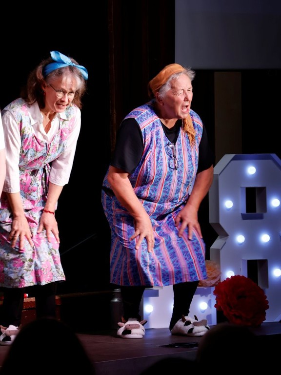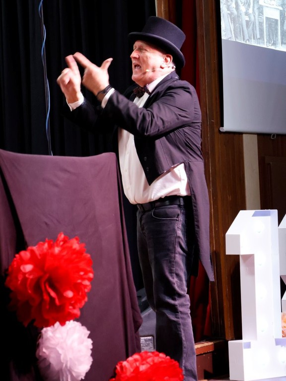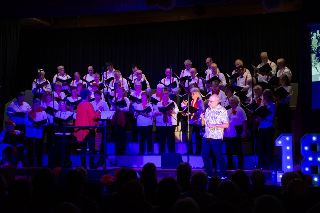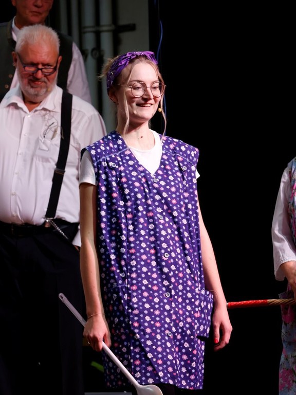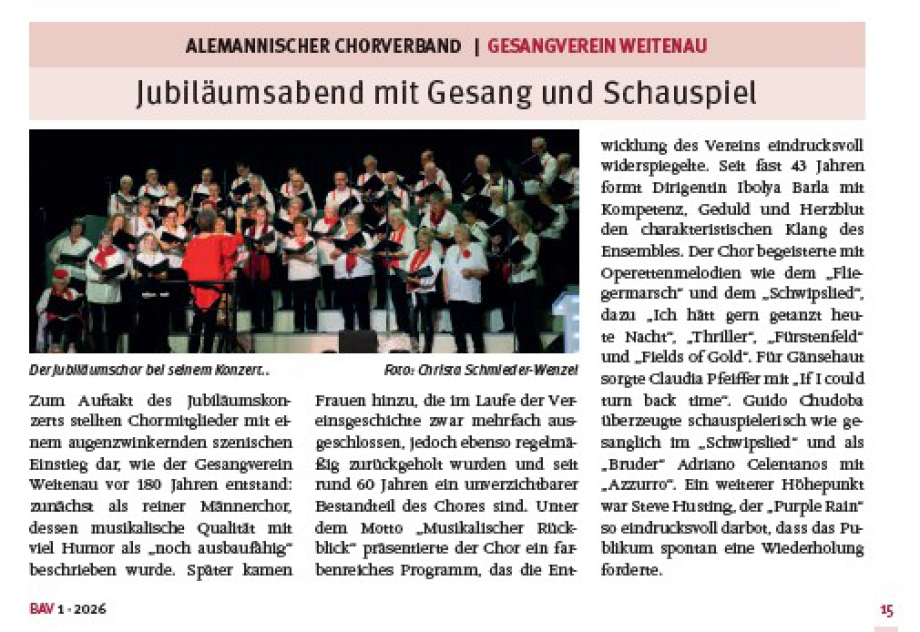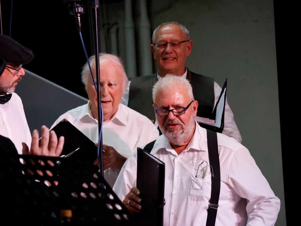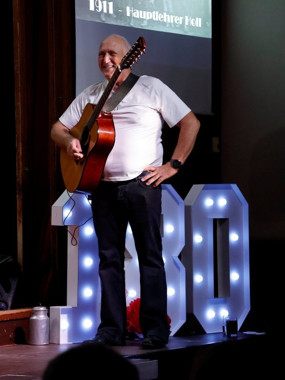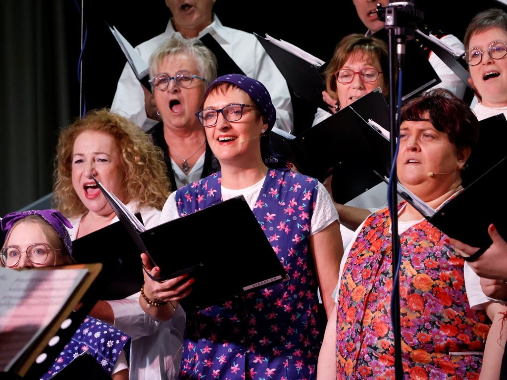 Nein, dies waren keine gängigen Jubiläumskonzerte. Keine Grußworte, keine Laudatio, kein langwieriger Konzertverlauf, sondern eine quicklebendige, rasante Zeitreise durch Jahrzehnte der Vereinsgeschichte zum „kleinen“ 180-Jährigen Bestehen unseres Vereines. Gesungen und für alle Sinne auch optisch und szenisch dargeboten mit viel Augenzwinkern und ausgewählten Einzelbildern aus mehreren Jahrzehnten. Bereits zu Beginn erntete Jörg Bregger als Oberlehrer Bäuerle, und sozusagen „Gründungsvater“ des Chores im Jahre 1845, Lachsalven, während sich die „Mannen“ noch schwer taten mit dem geordneten Singen. Die eher ungewöhnliche Geschichte des Vereines aufnehmend, in der bereits 1883 der erste Gemischte Chor bestand, gesellten sich schnell fünf Damen hinzu und zeigten den Herren im Song von den „Siebe chlieni Chüehli“, wie es geht. Danach sang sich der Chor abwechslungsreich durch die eigene Geschichte und Musikstücke in verschiedensten Stilrichtungen von Operette und Musical über Schlager bis hin zur Moderne mit Kulthits wie „Bohemian Rhapsody“ von Queen, „Thriller“ von Michael Jackson oder dem einfühlsamen „Fields of Gold“ von Sting.