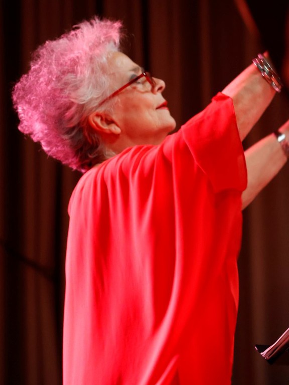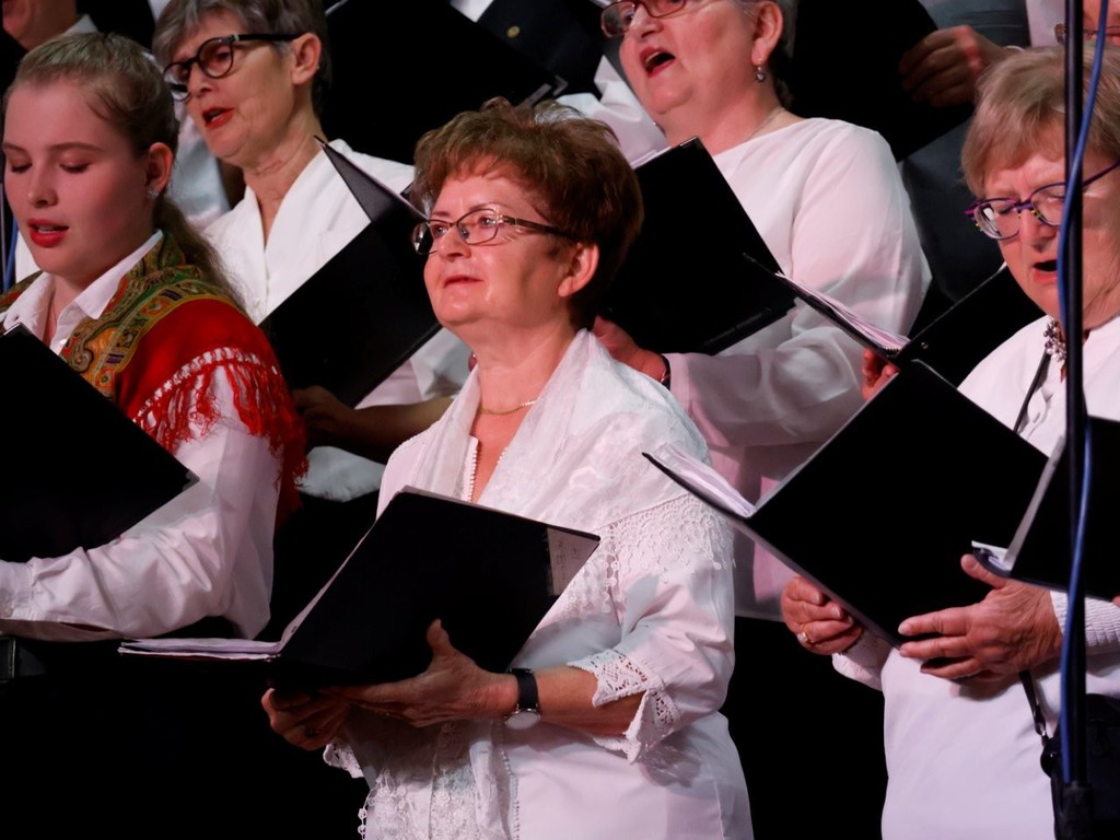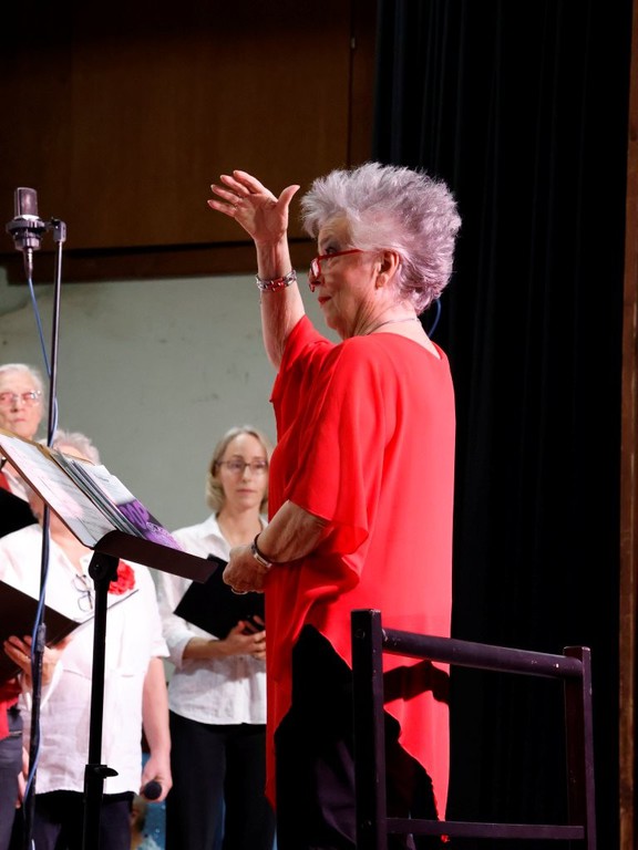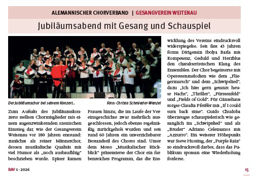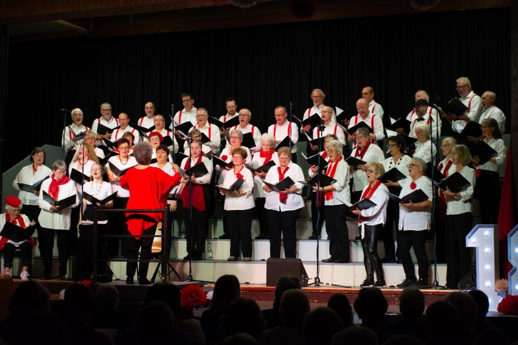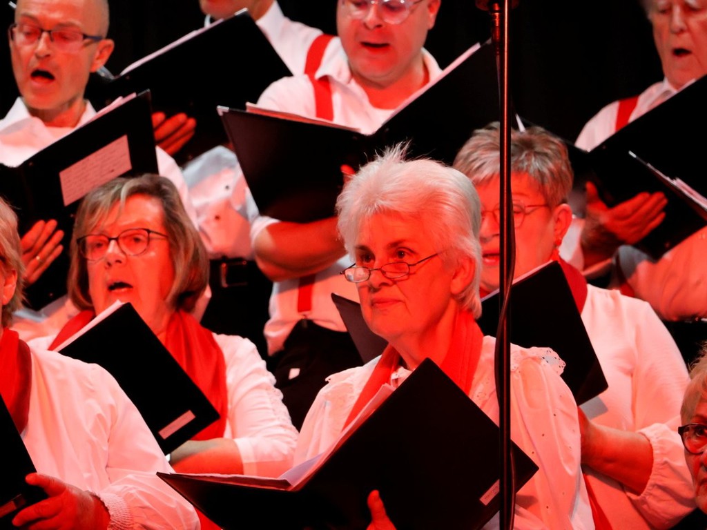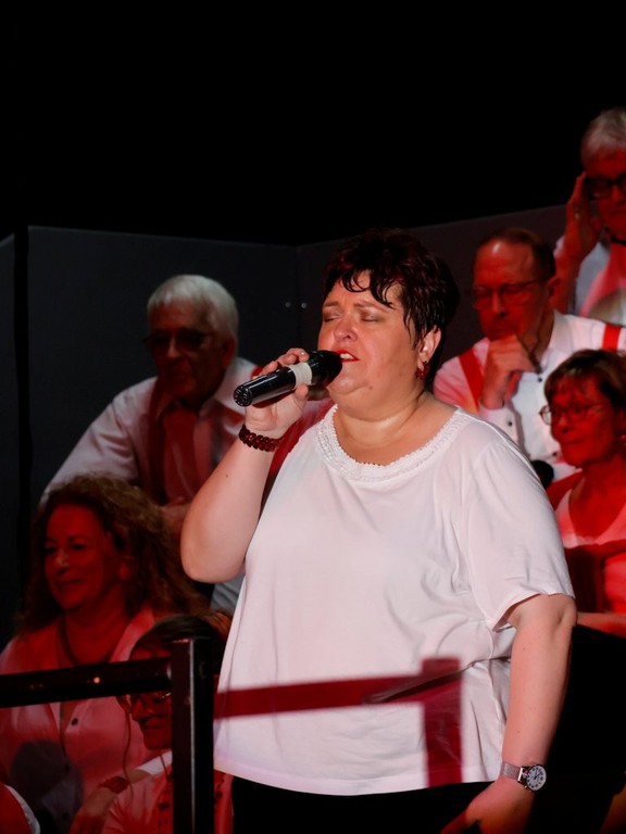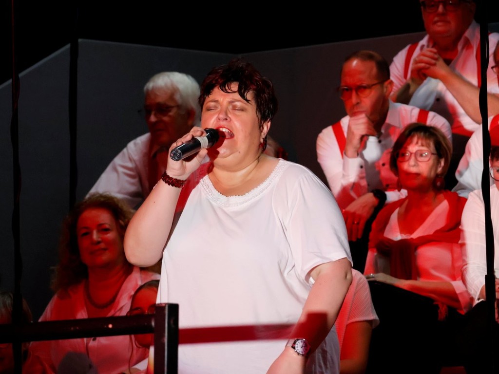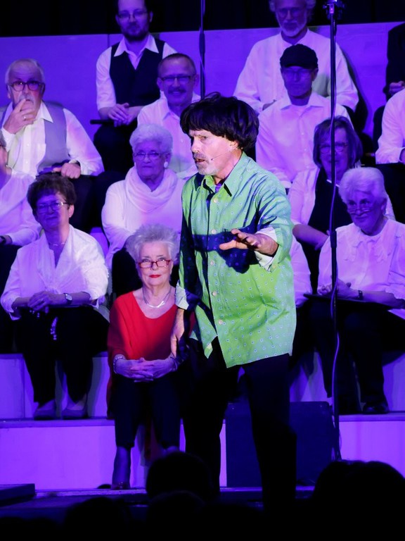 Auch das „Erscheinungsbild“ des Chores veränderte sich nach der Pause vom früher traditionell getragenen Schwarz-Weiß zum in Rot aufgepeppten, modernen Look. Kongenial und absolut passend zur Zeitreise die tollen Solostücke des Abends: ein komödiantisch in Höchstform auflaufender Guido Chudoba im „Schwipslied“ aus der Operette „Eine Nacht in Vendig“ oder persiflierend als jüngerer Bruder von Adriano Celentano in „Azurro“. Immer eine „Bank“ und seit Jahren so stimmgewaltig wie berührend ausdrucksstark Claudia Pfeifer in Chers „If I could turn back Time“. Als Sahnehäubchen dazu Steven Husting aus Lörrach mit seiner Joe Cocker Stimme und einer fulminanten Interpretation von Prince „Purple Rain“, untermalt vom Gemischten Chor. „We are the Champions“ setzte zusammen mit gezündeten Goldkonfetti-Kanonen den Schlussakkord unter zwei wunderbare, kurzweilige Konzertabende.